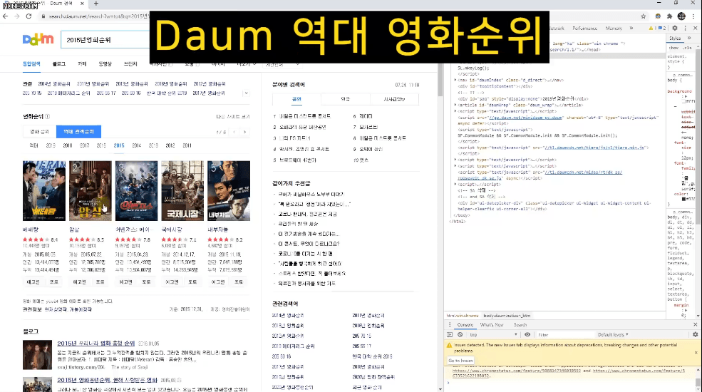 이미지를 다운로드 받는 연습도 해보구요. 제가 영화를 굉장히 좋아하는데 어떤 영화를 보면 좋을지 결정장애가 있어서 그냥 최근 5년간 관객 수가 가장 많은 상위 5개 영화에 대해서, 총 25 개 영화 포스터 이미지를 다운받아놓고 그중에 아무거나 선택을 하려 합니다. 이 이미지를 하나 하나 저장하려면 굉장히 많은 시간과 클릭질이 필요하지만 스크래핑 기술을 이용하면 몇 줄 안되는 코드로 파일명도 내가 원하는대로 저장할 수 있게 되지요.