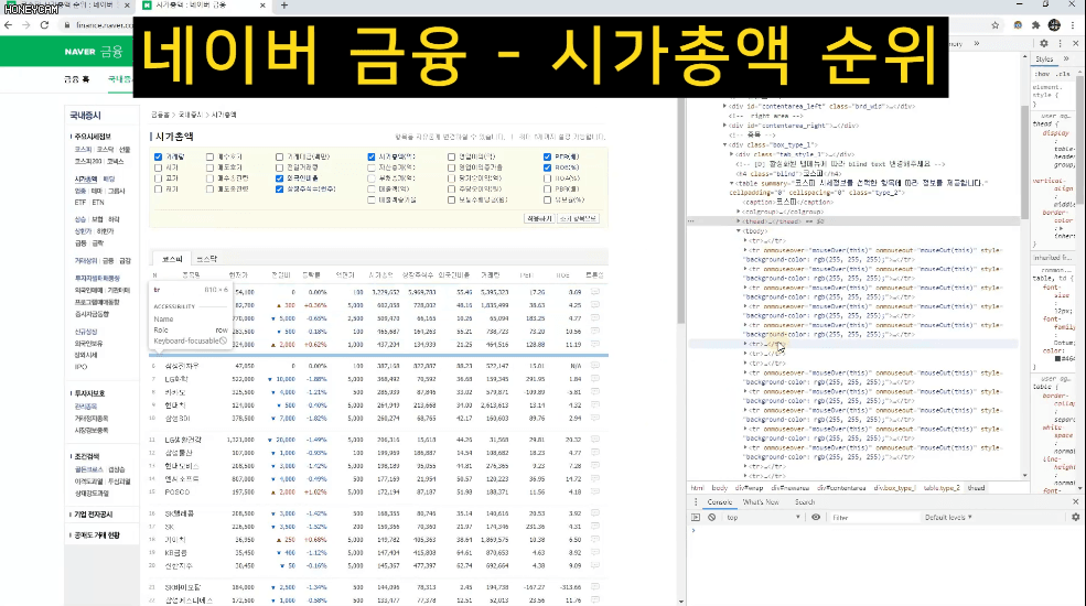 그리고 어떤 데이터들은 가지고 오고 나서 엑셀로 관리하거나 추가 작업을 해야할 때도 있습니다. 그럴때는 간단하게 csv 형태로 파일을 만들면 바로 엑셀에서 열어볼 수도 있어요. 네이버 금융에서 코스피 시가총액 순위 정보를 모두 가져와보는 실습을 합니다.