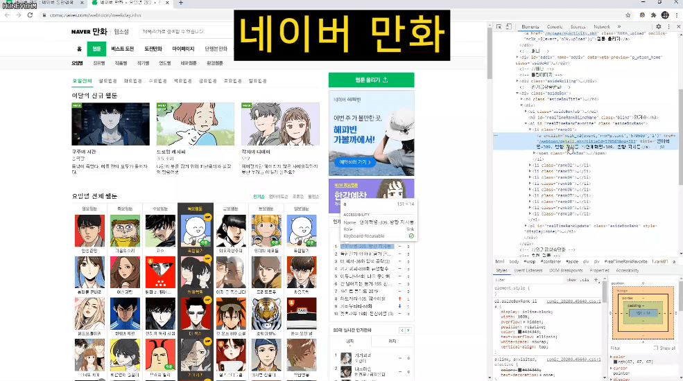 예를 들어 네이버 웹툰 페이지에 있는 모든 만화의 제목이나 실시간 순위 1-10 을 가져온다던지,