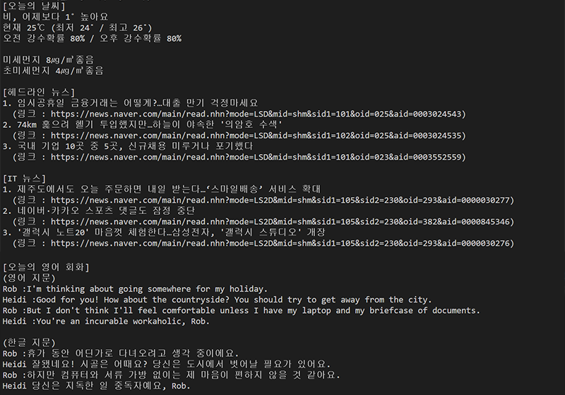 제가 매일 아침에 일어나서 날씨를 확인하고, 주요 뉴스 및 IT 분야 뉴스를 읽는 것을 쉽게 해주는 프로그램을 만들겁니다. 하는 김에 1일 1영어 학습을 위해 매일 새로운 영어 회화 지문을 가져오는 것도 함께 해봅니다. 클릭 한 번이면 이 모든 정보들이 제가 원하는 형태로 가져와지는 것이죠.