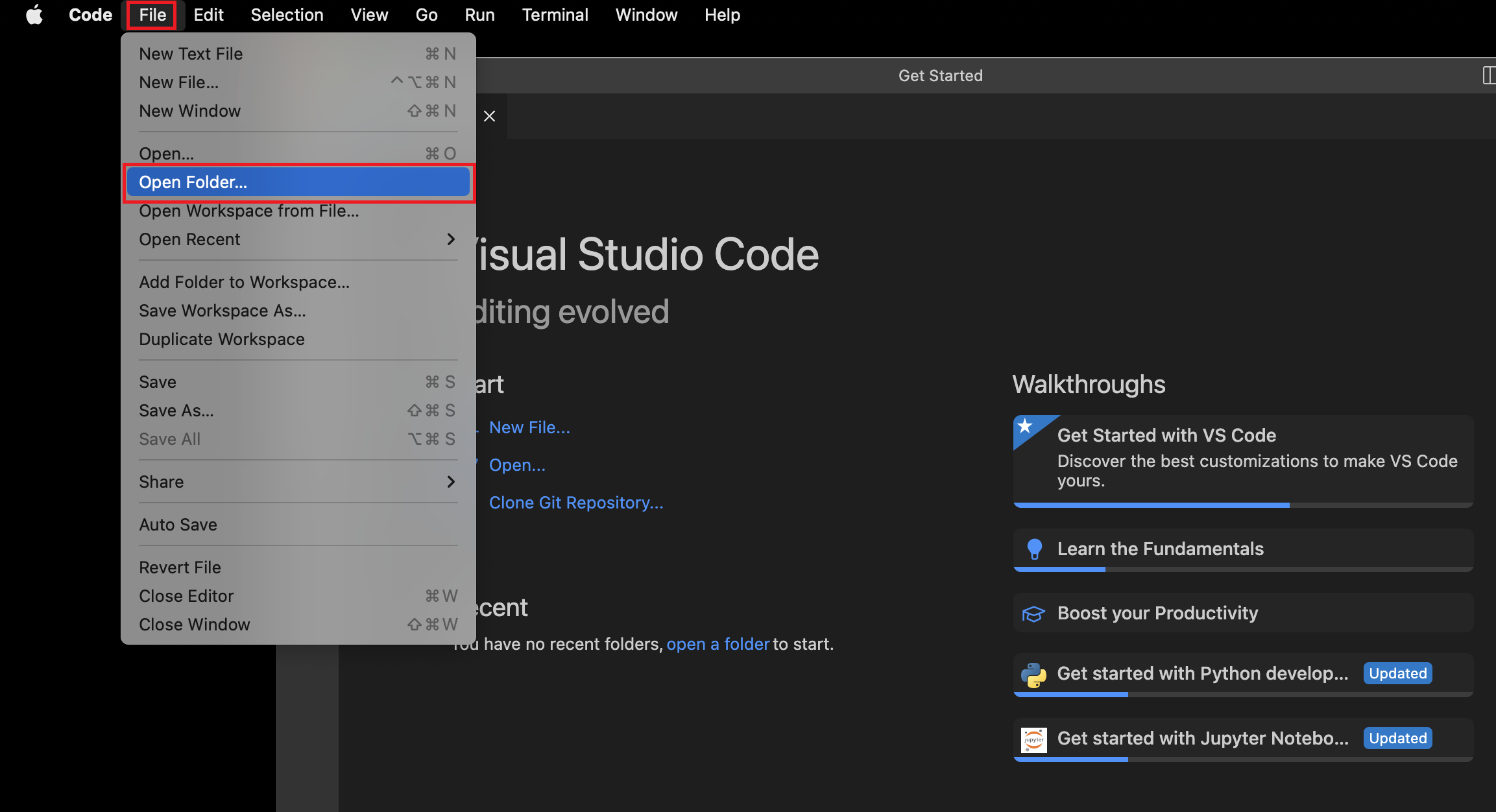 7. 메뉴에서 File > Open Folder 를 클릭합니다.