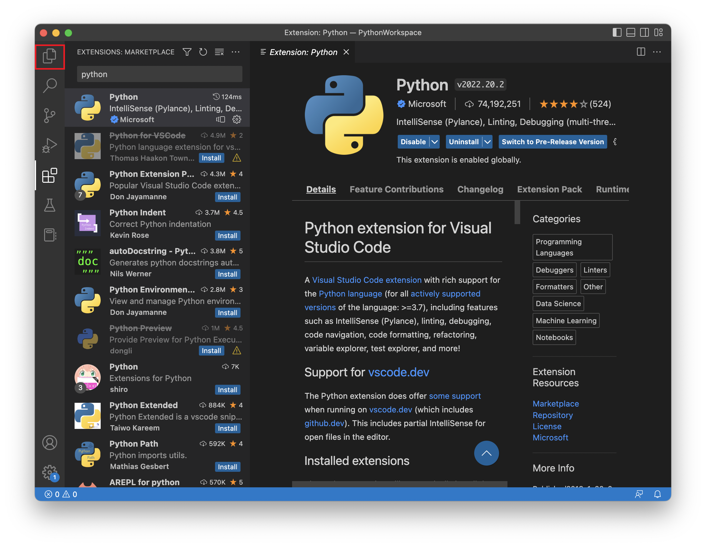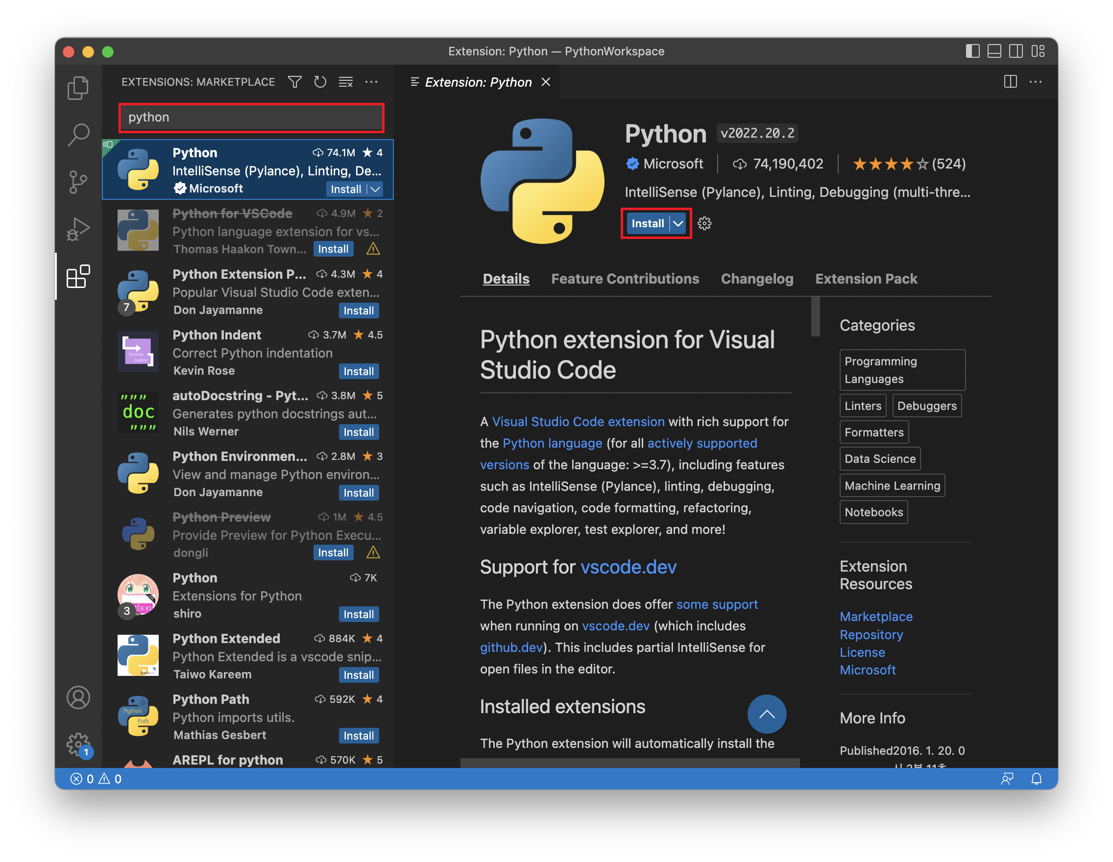 5. 검색창에서 'python' 을 입력하고 조회된 항목을 선택 후 우측 화면에서 Install 버튼을 클릭하여 설치합니다.