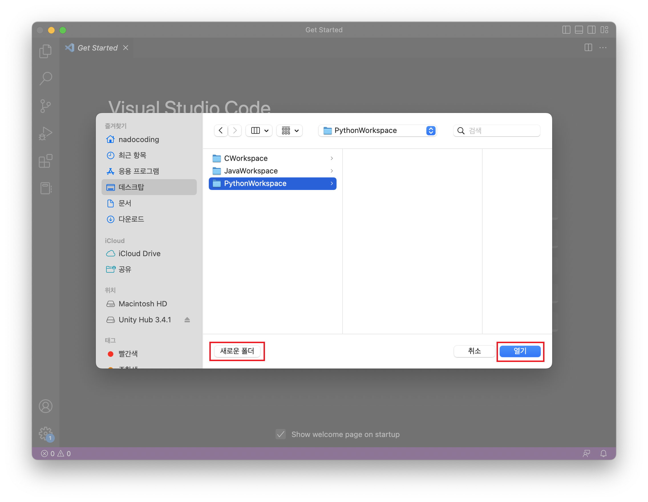 8. 데스크탑에 새로운 폴더 (예: PythonWorkspace) 를 만들고 열기 버튼을 클릭합니다.