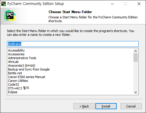6. 시작 메뉴 폴더를 만드는 화면에서 Install 버튼을 클릭합니다.