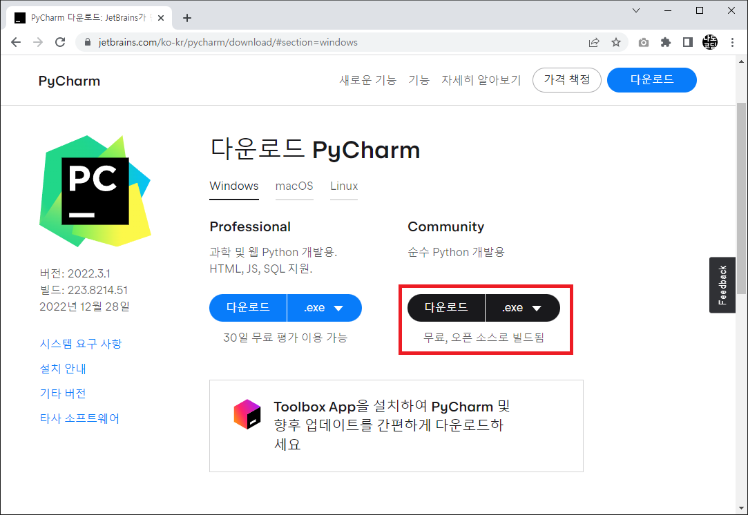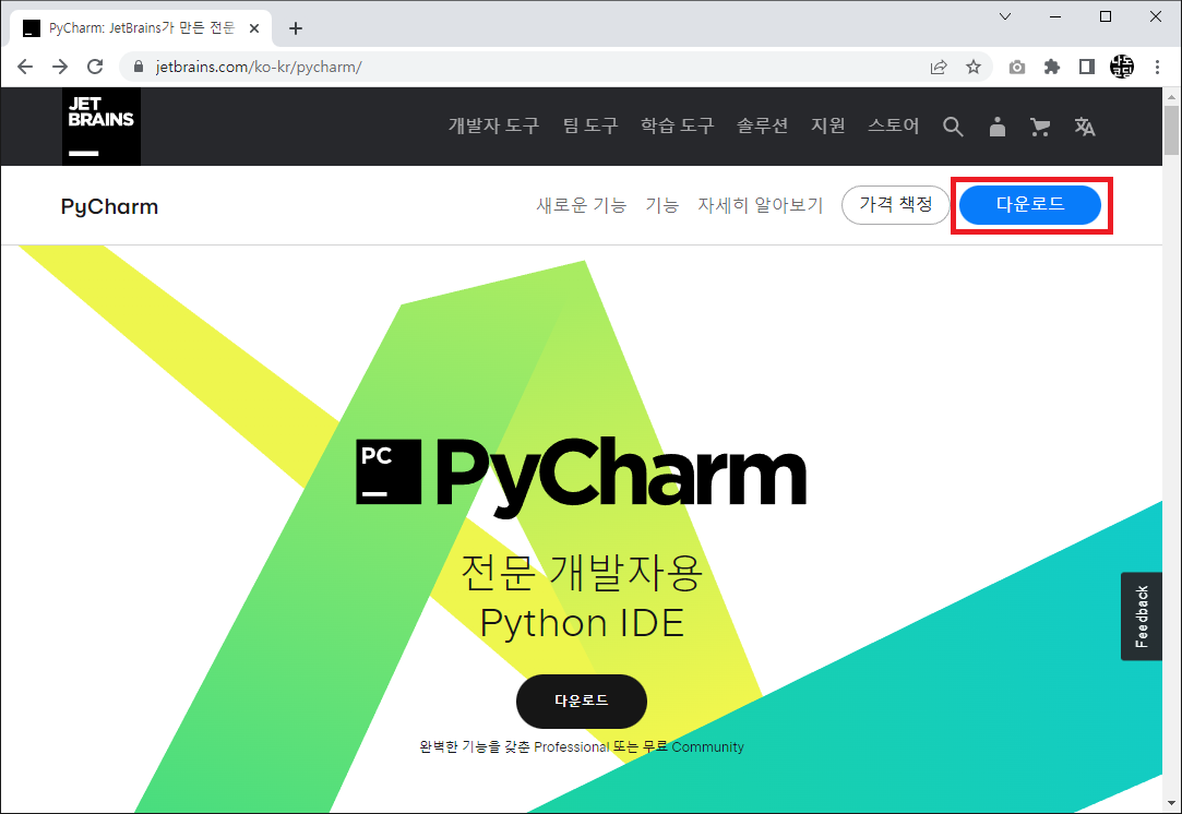 1. 공식 홈페이지(https://www.jetbrains.com/ko-kr/pycharm/) 에 접속 후 다운로드 버튼을 클릭합니다.