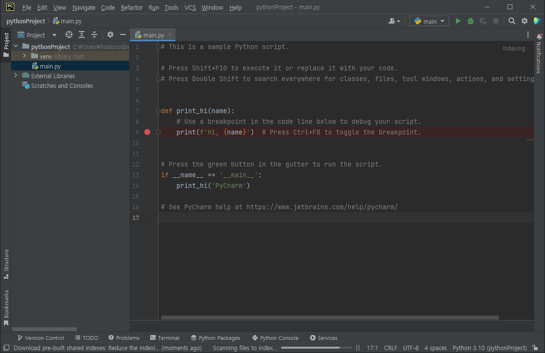 13. 우측 상단의 초록색 삼각형 버튼을 클릭하여 파일을 실행했을 때 아래에 Hi, PyCharm 이라는 문장이 출력되면 정상적으로 환경 설정이 완료된 것입니다.