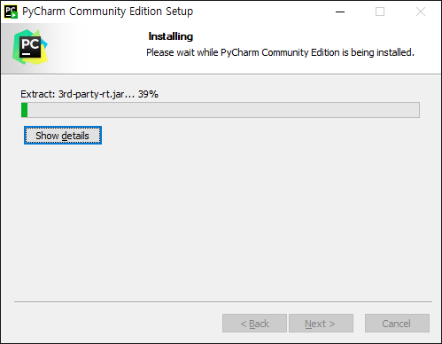 8. 설치가 완료되면 Run PyCharm Community Edition 옵션을 체크하고 Finish 를 클릭하여 파이참 프로그램을 실행합니다.