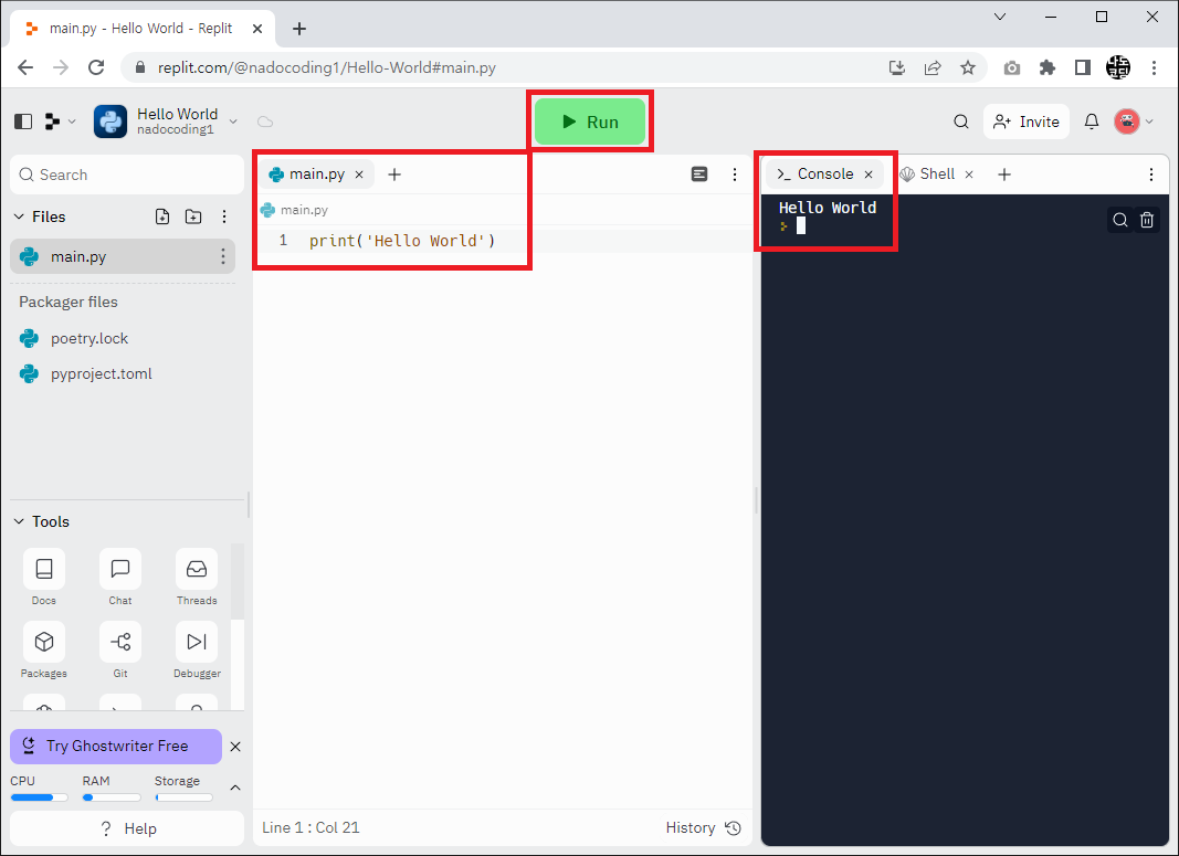 8. 자동으로 만들어진 main.py 파일의 본문 영역에 아래 코드를 입력하고 상단의 초록색 Run 버튼을 눌렀을 때 우측 Console 창에서 Hello World 가 출력되면 정상적으로 환경 설정이 완료된 것입니다.