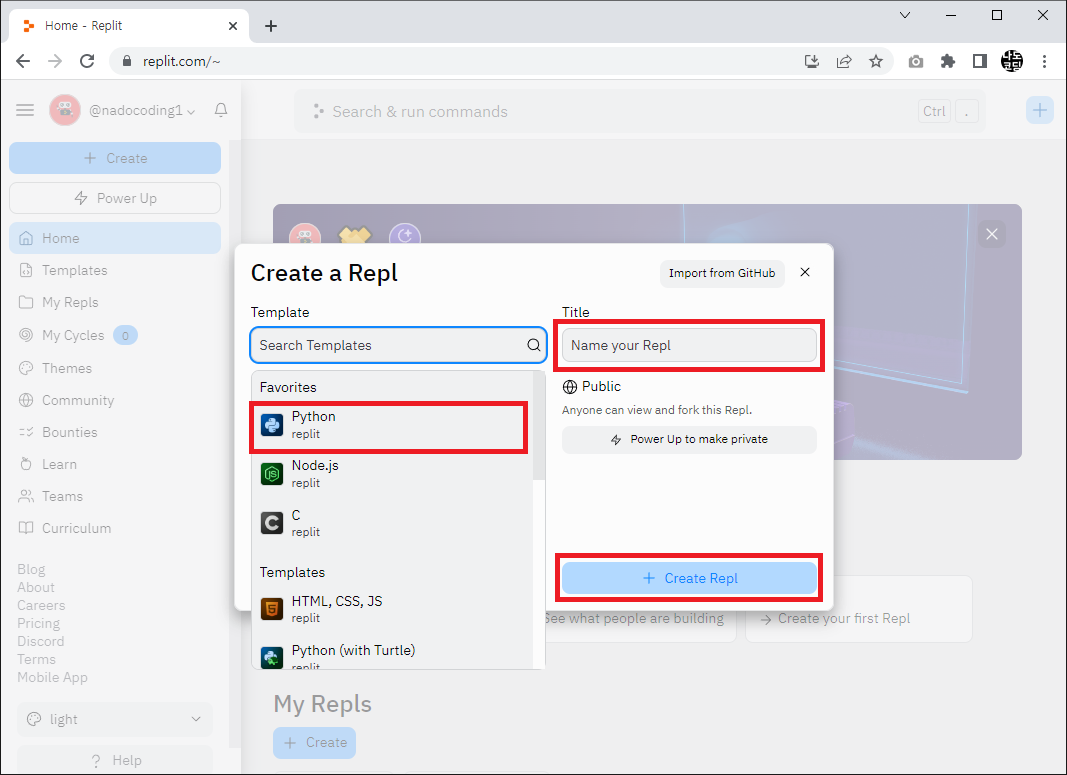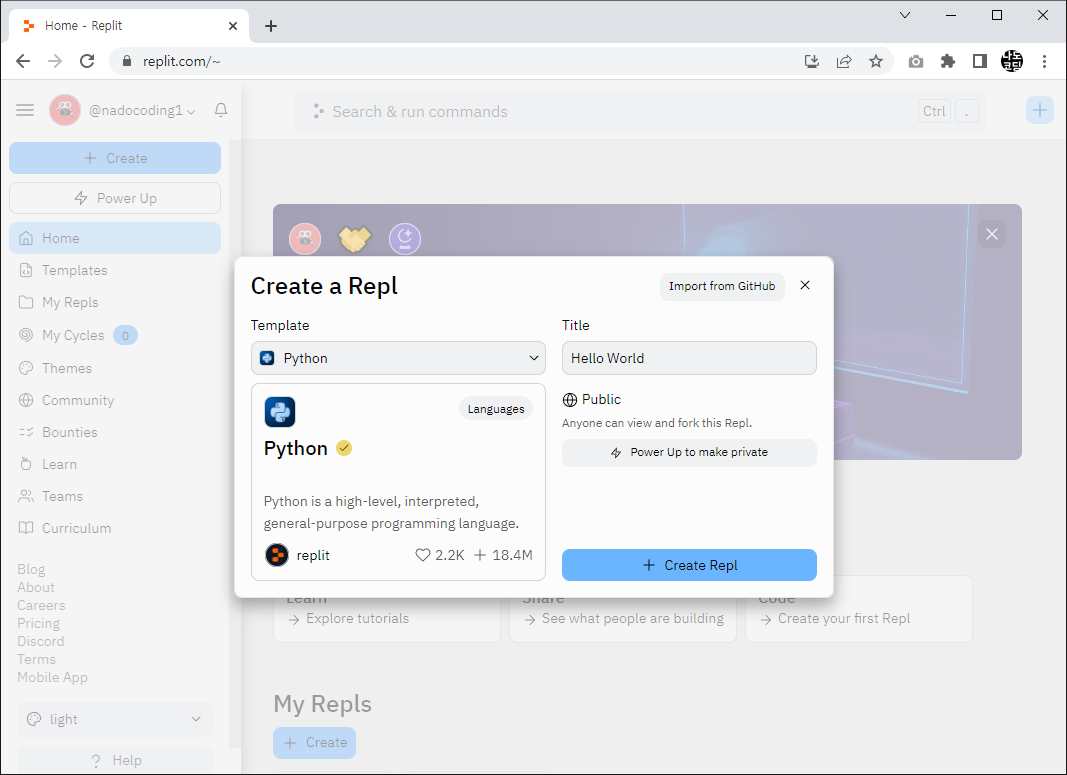 6. 개발을 원하는 프로그래밍 언어(예: 파이썬) 를 선택하고 제목(예: Hello World) 을 작성한 뒤 Create Repl 버튼을 클릭합니다.