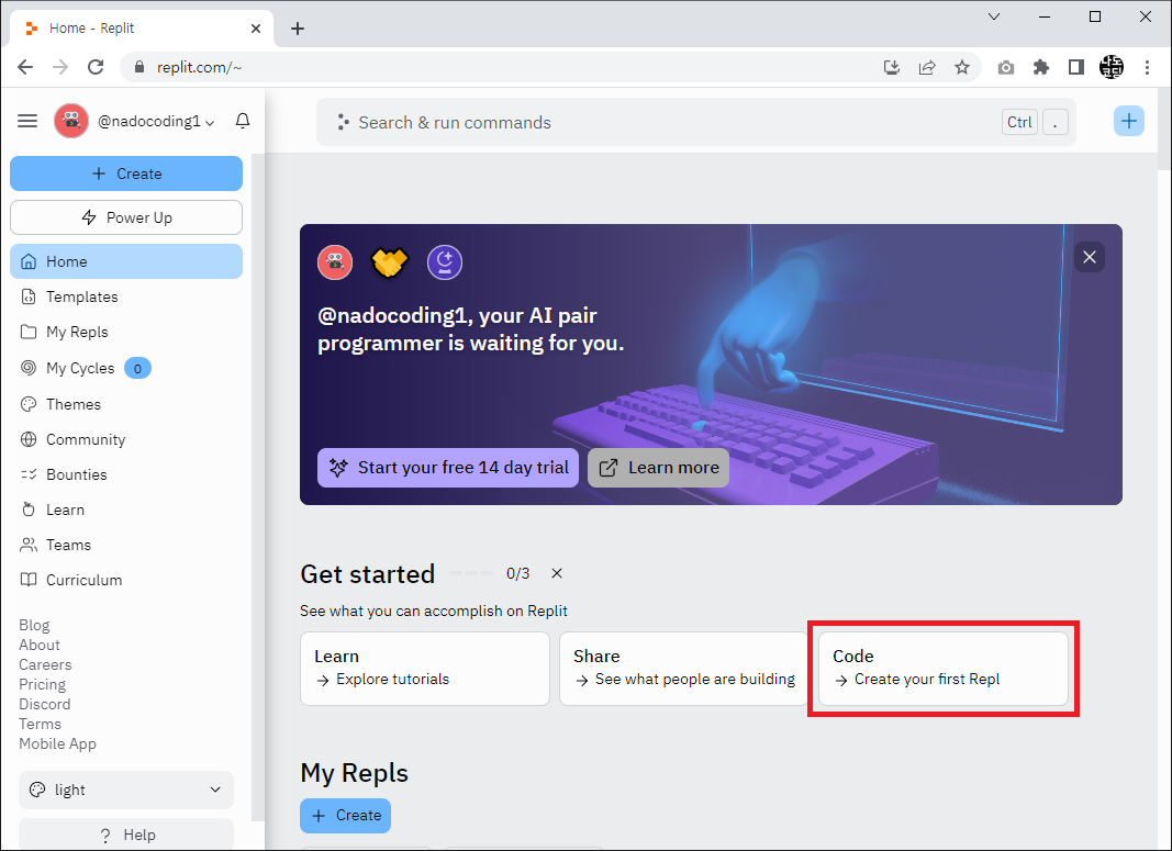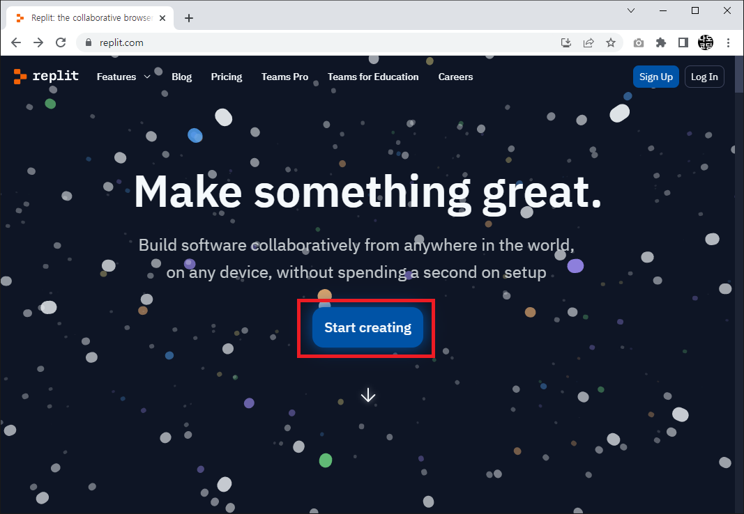 1. 공식 홈페이지(https://replit.com/) 에 접속 후 Start creating 버튼을 클릭합니다.
