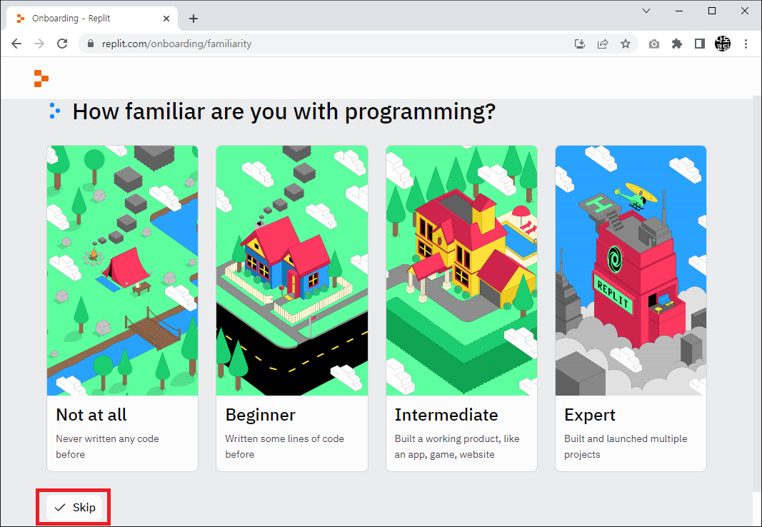 3. 프로그래밍 경험을 묻는 화면에서 적합한 항목을 선택합니다. 저는 Skip 을 누르도록 하겠습니다.