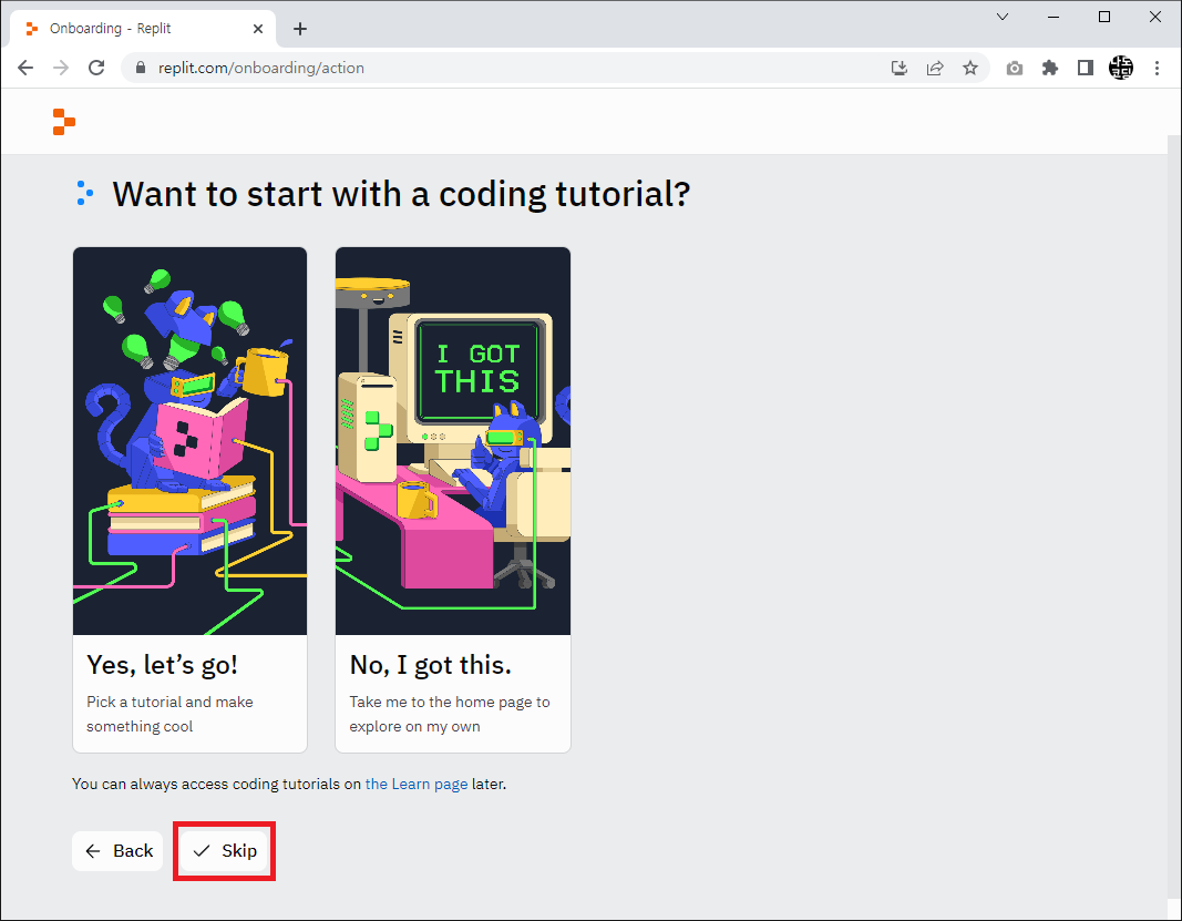 4. 튜토리얼을 확인할지 물어보는 화면입니다. 궁금하신 경우 튜토리얼을 보셔도 되며, 저는 Skip 을 누르겠습니다.