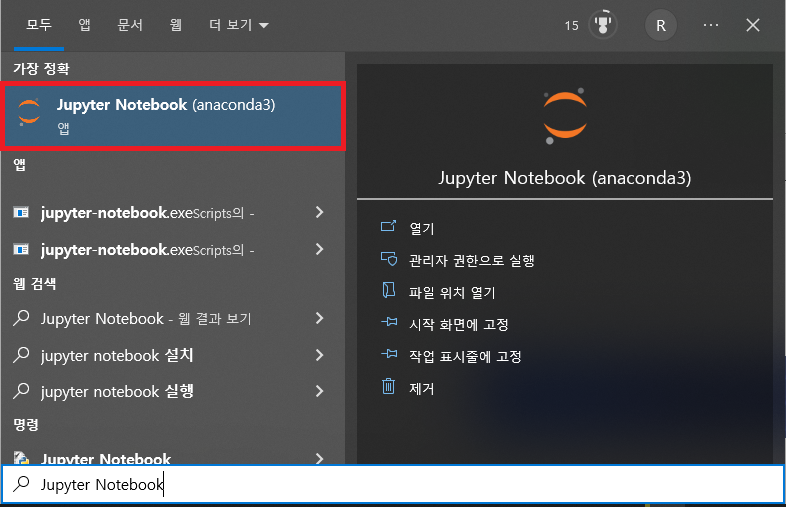 11. 윈도우 시작 메뉴에서 Jupyter Notebook 을 검색 및 실행합니다.