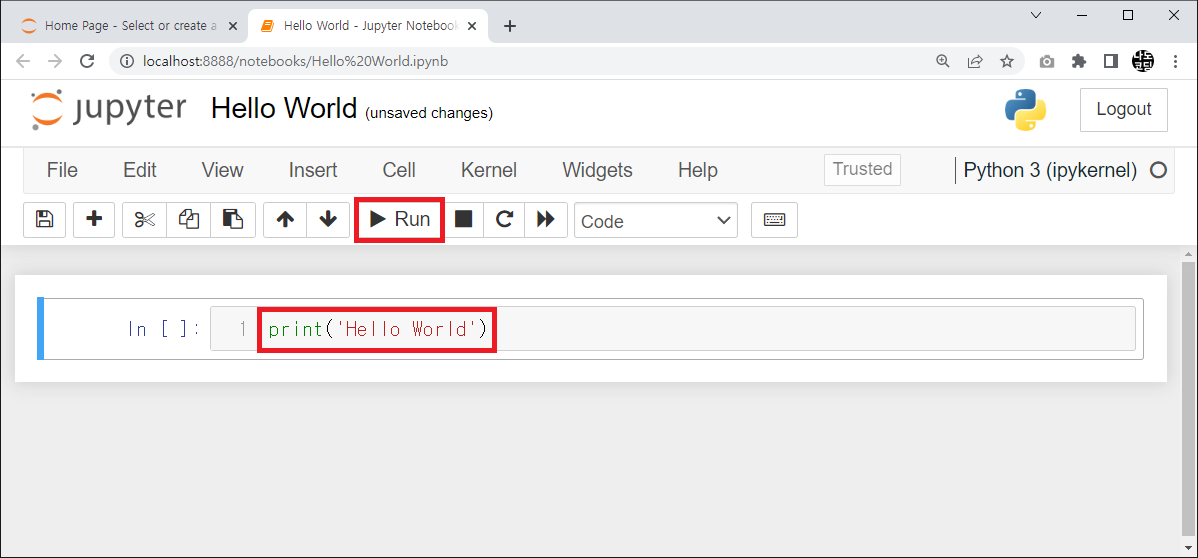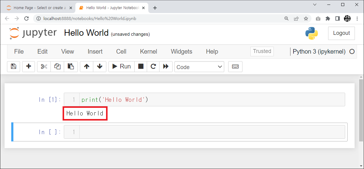 16. 셀 하단에 Hello World 라는 문장이 출력되면 정상적으로 환경 설정이 완료된 것입니다.