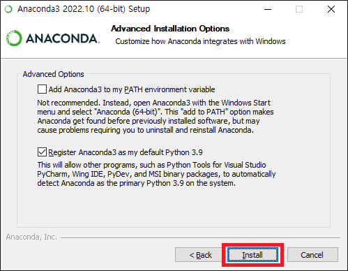 6. 고급 옵션은 기본값으로 두고 Install 을 클릭합니다.