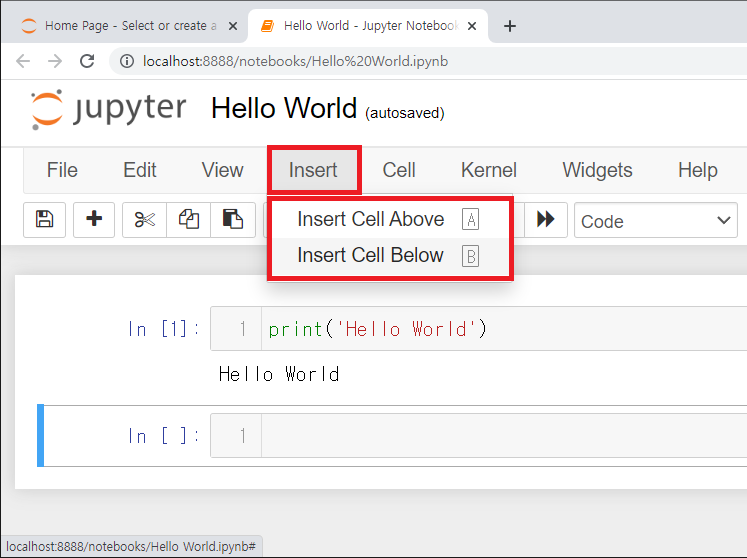 17. Insert 메뉴의 Insert Cell Above 또는 Below 를 통해 위 / 아래에 셀을 추가하여 코드를 작성할 수 있습니다.