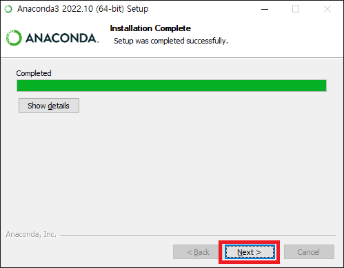 8. 설치가 완료되면 Next 버튼을 클릭합니다.