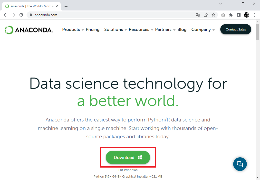 1. 공식 홈페이지(https://www.anaconda.com/) 에 방문하여 Download 버튼을 클릭합니다.