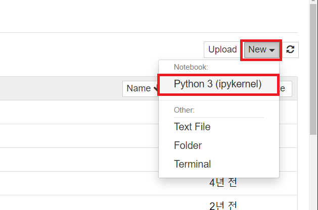 13. 우측 상단에서 New 메뉴를 클릭한 뒤 Python 3 를 클릭하여 새로운 탭을 띄웁니다.