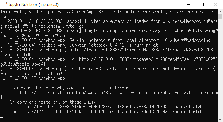 12. 다음과 같은 창이 나타나며 잠시 뒤 브라우저에 Jupyter 아이콘을 포함한 화면이 보여집니다.