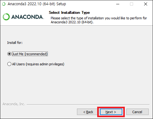4. 설치 타입은 Just Me 로 하고 Next 를 클릭합니다.