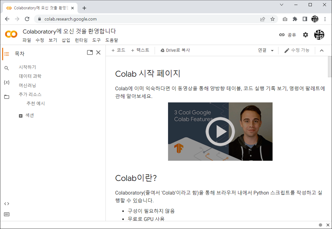 1. 공식 홈페이지(https://colab.research.google.com/)에 접속합니다.