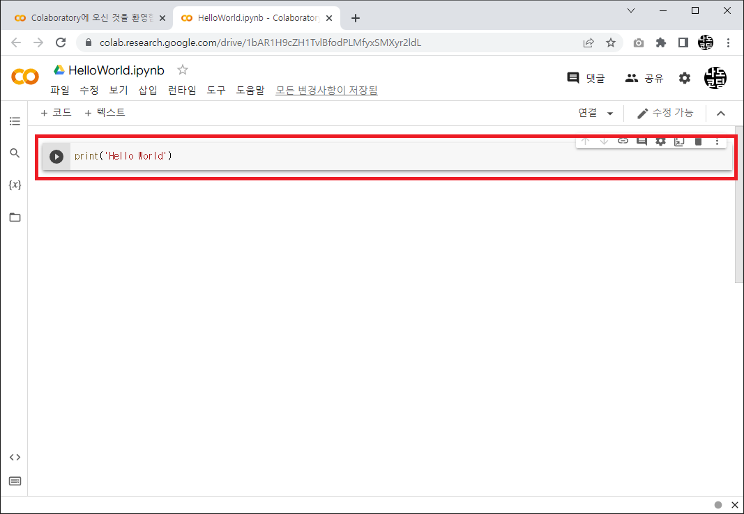 7. 코랩은 셀 단위로 코드를 실행시킬 수 있으며 좌측 상단의 + 코드 버튼을 통해 셀을 추가할 수 있습니다.