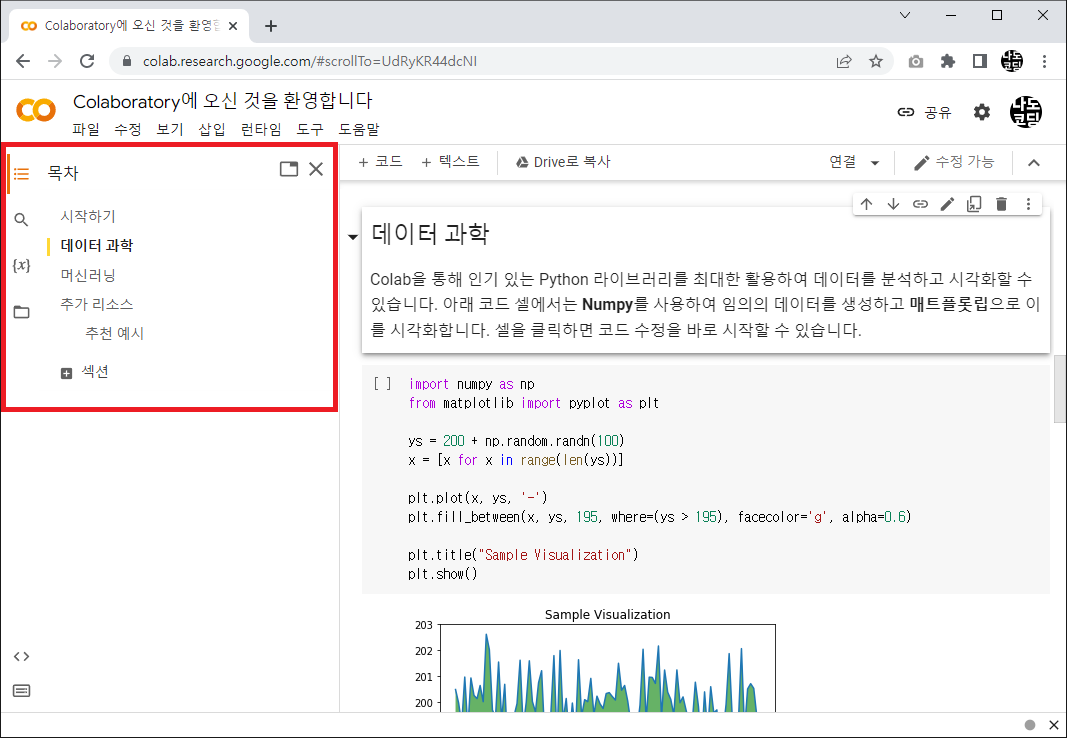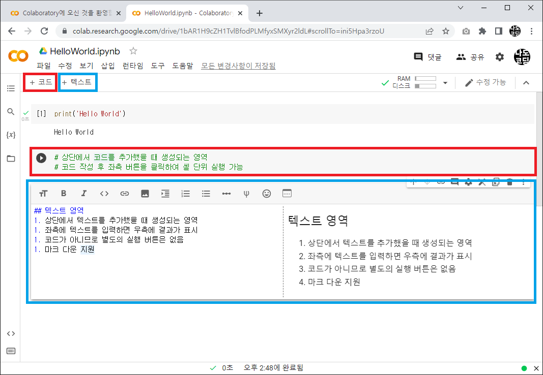 필요한 경우 + 텍스트 버튼을 통해 코드를 설명하는 등의 내용을 담은 일반 텍스트를 위한 셀을 추가할 수도 있습니다.