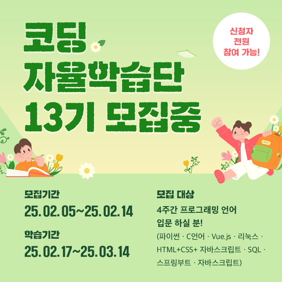 | 코딩 자율학습단 14기 모집 안내 (1) | 2025.03.28 |