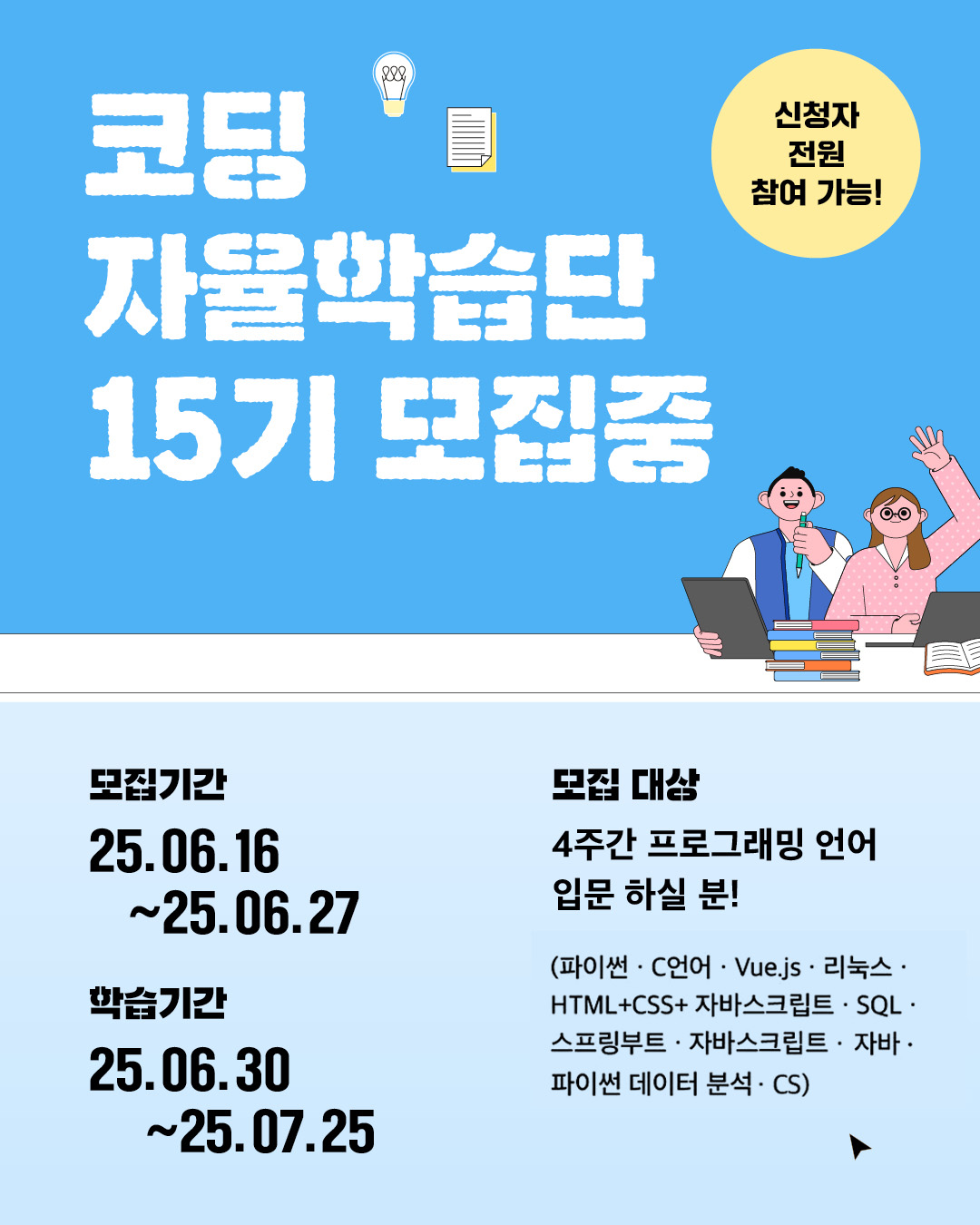 | 코딩 자율학습단 16기 모집 안내 (10) | 2025.08.02 |