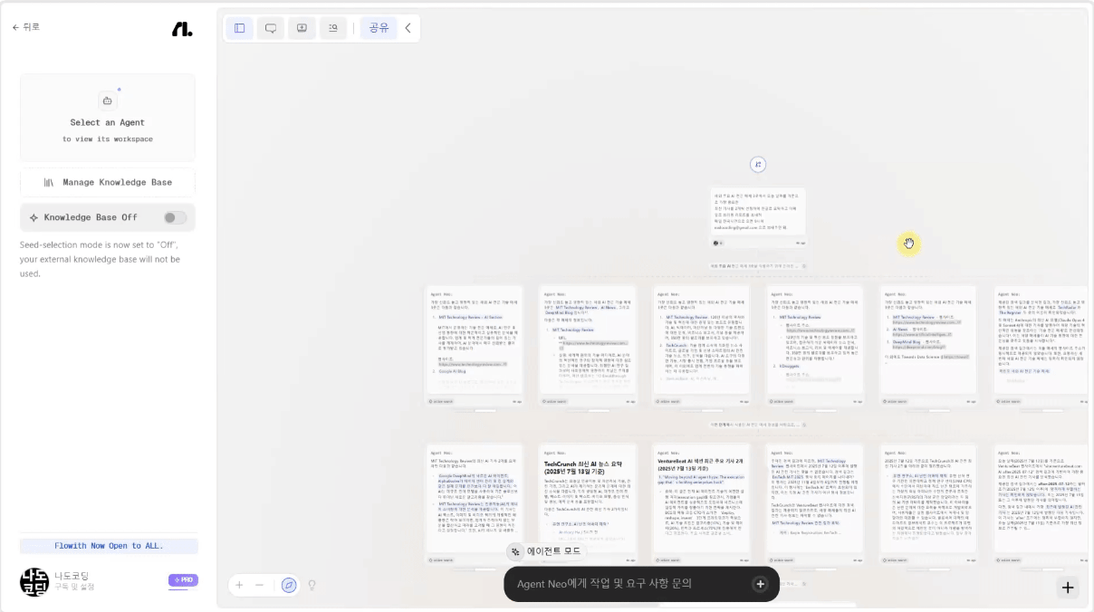 Flowith는 우리가 익숙하게 써오던 챗GPT 같은 텍스트 기반 대화의 틀을 깨고, 더 넓고 입체적인 사고 흐름을 시각화하며 대화할 수 있는 플랫폼입니다. 그리고 단순한 대화형 AI를 넘어서, 스스로 분석하고 계획하고 행동하는 ‘AI 에이전트 Neo’라는 놀라운 기능까지 갖춘 서비스이기도 하죠.