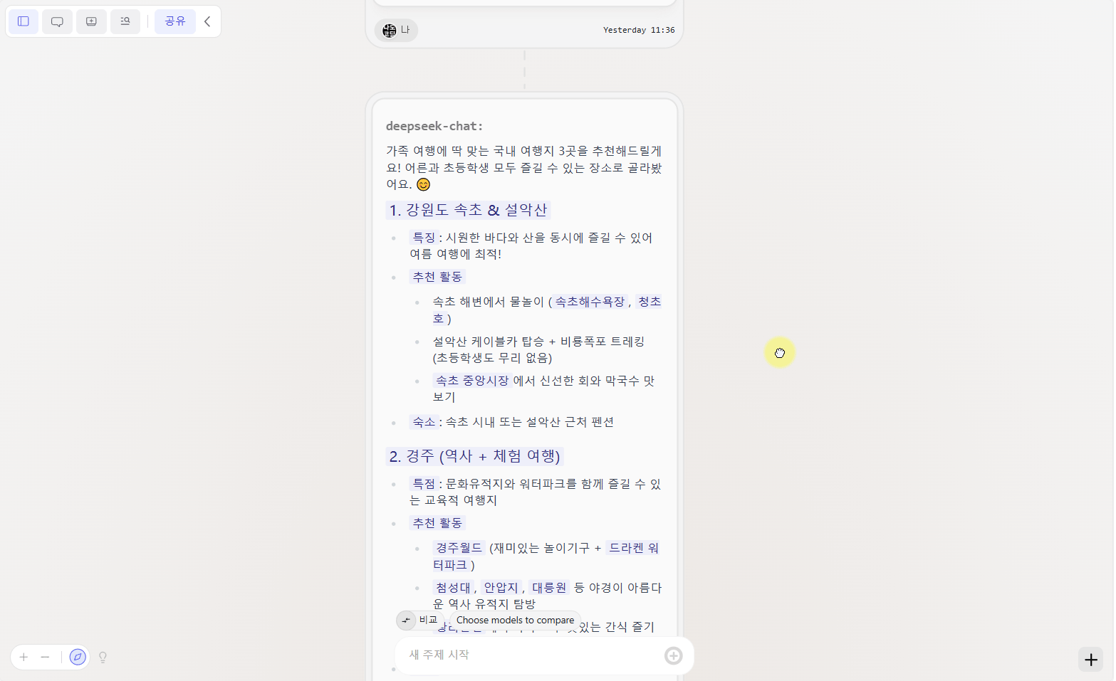 예를 들어, “가족 여행지 3곳 추천해줘”라고 질문한 후, 각 여행지에 대해 구체적인 일정을 추가로 요청하면, 각각의 가지로 뻗어나가는 구조로 정보를 정리할 수 있습니다.