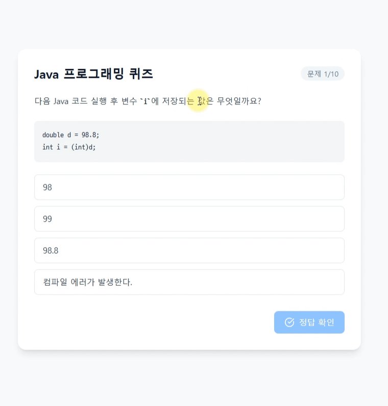 - “자바 PDF 강의 자료를 바탕으로 퀴즈 10개 만들어줘”