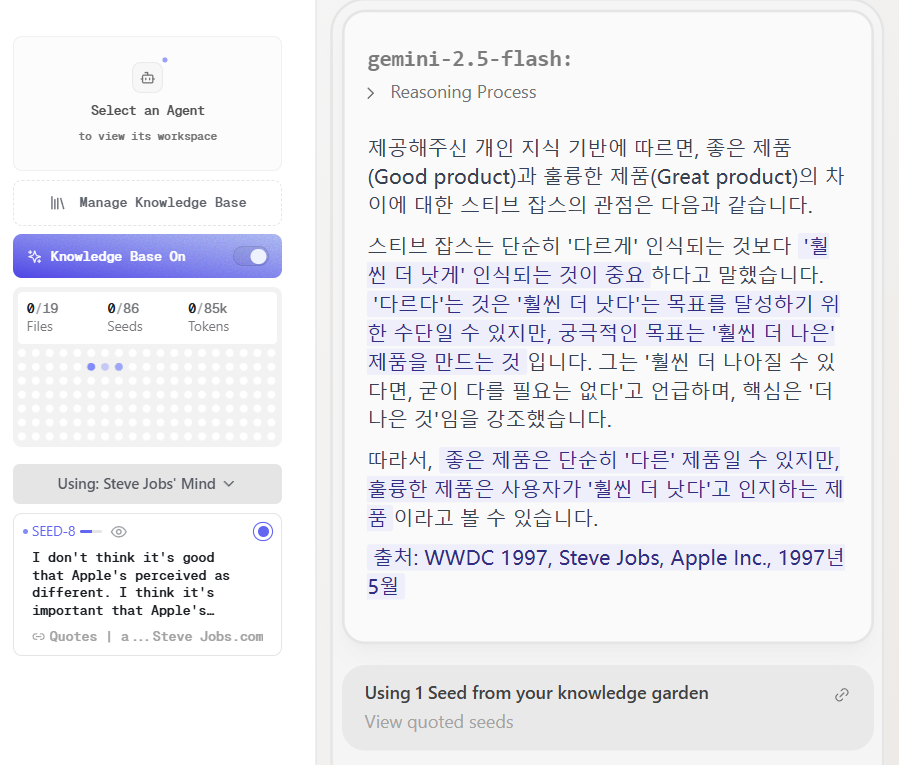 예를 들어, “스티브 잡스가 생각하는 좋은 제품과 훌륭한 제품의 차이는?” 이라는 질문을 하면, 미리 업로드 된 스티브 잡스 관련 문서에서 관련 내용을 찾아 정확하게 응답해줍니다.