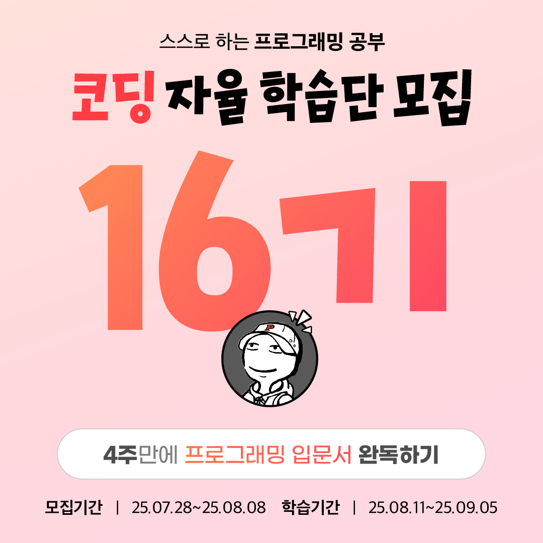 | 코딩 자율학습단 17기 모집 안내 (0) | 2025.09.18 |