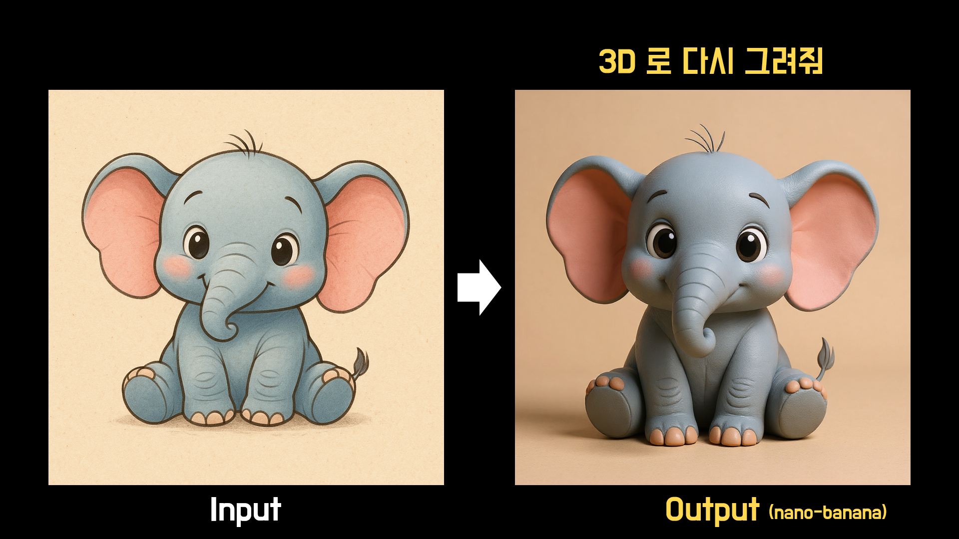과거에는 모델이 제 멋대로 재해석을 하여 완전 새로운 그림을 그리거나 특징을 미묘하게 바꾸는 문제가 있었는데, 나노 바나나 모델의 도움을 받았더니 앉은 자세, 표정, 색상, 크기, 모든 게 그대로 2D 에서 3D 로 바뀌었습니다.