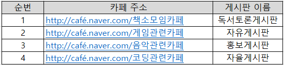 만약 카페 목록을 추가하거나 게시판 이름이 변경되거나 하면, 1번의 엑셀 파일 내용만 바꿔주면 되지요.