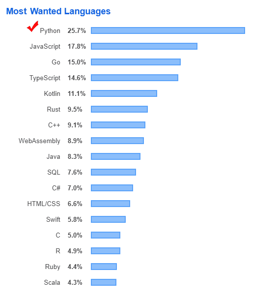 Stack Overflow 설문 응답에서 가장 주목 받고 있는 언어가 바로 파이썬입니다.
