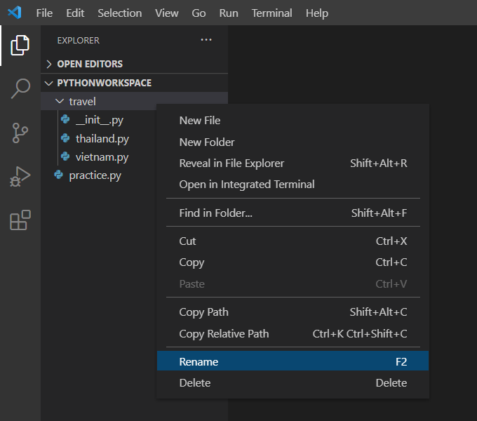 그리고 현재 작업 공간 내의 travel 폴더는 임시로 travel_temp 로 이름을 변경하겠습니다. Visual Studio Code 에서 travel 폴더를 마우스 오른쪽 버튼 클릭하여 Rename 메뉴를 선택하면 이름 변경이 가능합니다.