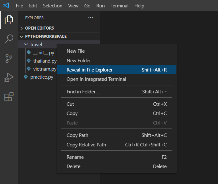 앞에서 패키지나 모듈은 "파이썬 라이브러리들이 모여 있는 폴더" 에 있으면 사용 가능하다고 했는데요. 확인을 위해 travel 패키지 폴더를 lib 폴더로 복사해보도록 하겠습니다. 폴더 복사를 위해서는 파일 탐색기를 직접 실행하여 작업 중인 폴더로 이동하셔도 되고, 또는 Visual Studio Code 에서 travel 폴더를 마우스 오른쪽 버튼으로 클릭하여 Reveal in File Explorer 메뉴를 선택하셔도 됩니다.