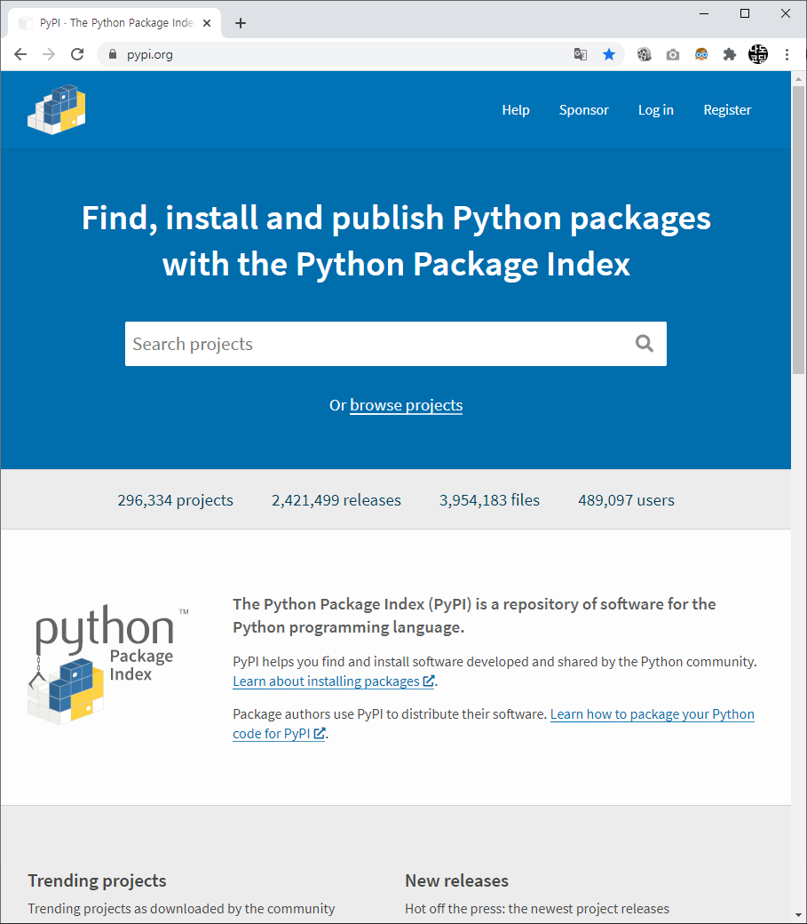 우선 파이썬 패키지를 어떻게 찾아볼 수 있는지 방법을 알아보겠습니다. 브라우저를 열고 구글에서 pypi 라고 검색을 하면 첫 페이지에 나오는 pypi.org 를 확인할 수 있는데 이 곳을 방문합니다. 또는 주소창에 바로 https://pypi.org 라고 입력을 하는 방법도 있습니다.