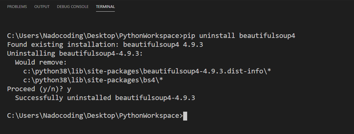 패키지를 삭제할 때는 정말 삭제할지 여부를 다시 한 번 확인하는데 삭제를 원한다면 y 를, 원하지 않는다면 n 을 입력 후 Enter 를 누릅니다.