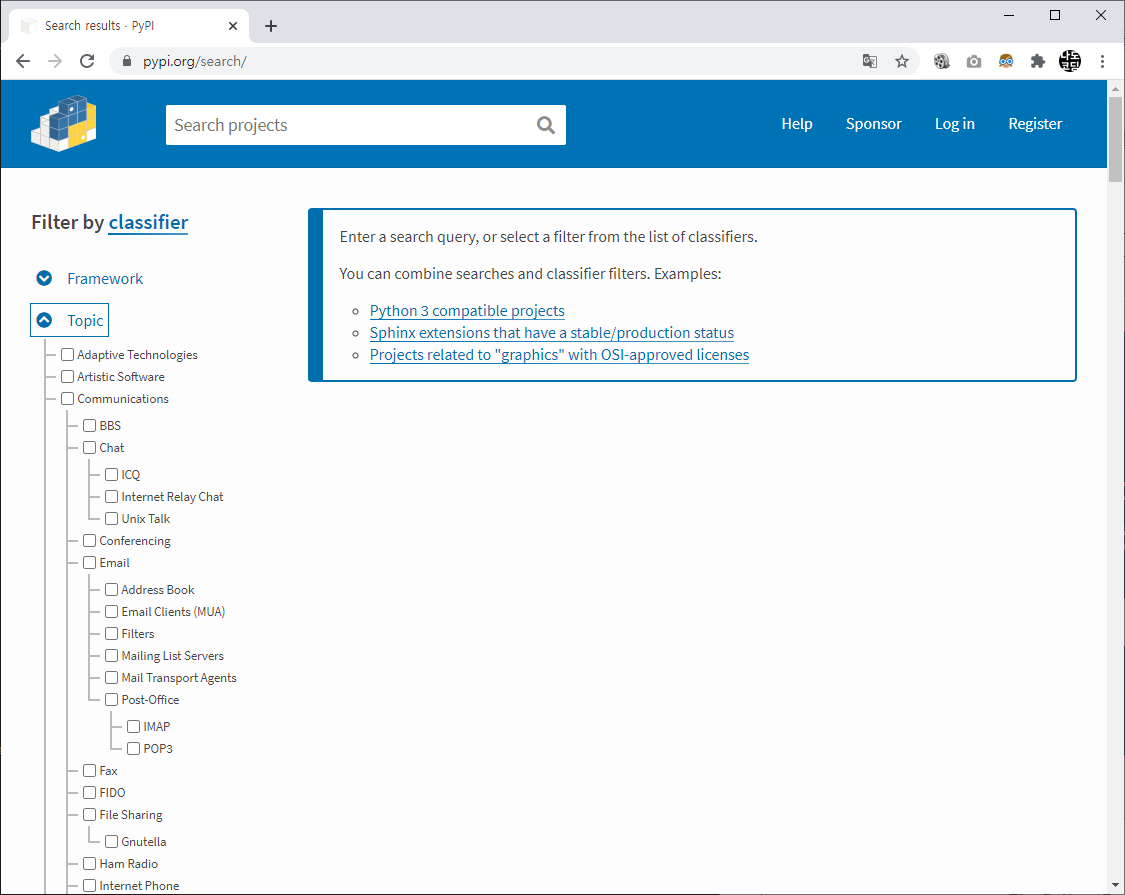 좌측에서 Topic 부분을 클릭하여 확대를 해보면 주제별로 어떤 프로젝트가 있는지를 확인할 수 있습니다. 스크롤을 내려보면 Email, Database, Game, Internet 등 다양한 주제가 있는데 원하는 주제를 선택하면 주제에 맞는 프로젝트 목록이 우측에 나타나게 됩니다.