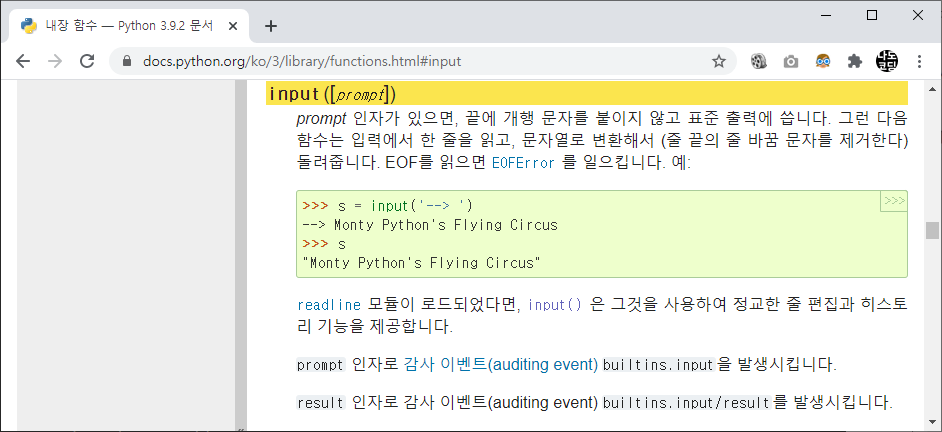 각 내장 함수를 클릭해보면 설명을 확인할 수 있으며 예제 코드가 함께 제공되는 경우도 있습니다. 예를 들어 input() 을 클릭하면 다음과 같은 내용을 확인할 수 있습니다.