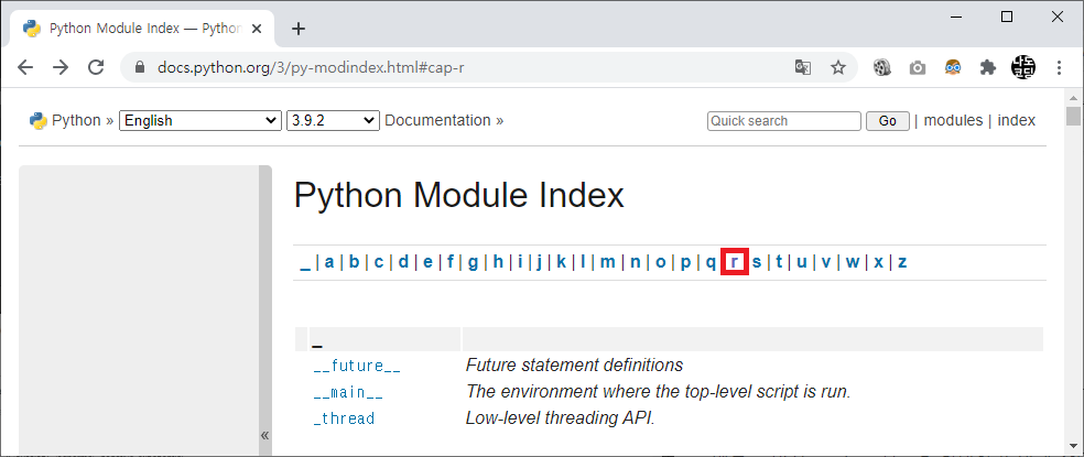 예를 들어서 random 모듈에서 사용가능한 함수 정보를 확인하기 위해 상단의 r 을 클릭하고 이어서 페이지에 나타나는 random 을 클릭합니다.