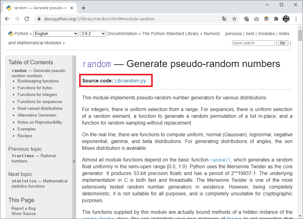 모듈 페이지는 다음과 같이 상단에 요약 정보와 파이썬 설치 경로 내의 파일 위치 (Lib/random.py) 가 표시되며, 이어서 모듈에 대한 자세한 설명이 제공됩니다. 스크롤을 조금 더 내리면 모듈 내에서 사용 가능한 함수들 및 예제 코드를 확인할 수 있습니다.