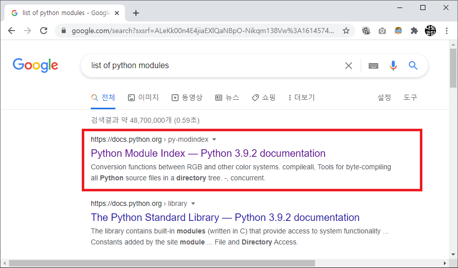 내장 함수와는 다르게 외장 함수를 사용하기 위해서는 반드시 해당 모듈을 import 해야 합니다. 먼저 파이썬에서 제공되는 모듈을 살펴보기 위해 구글에서 "list of python modules" 로 검색합니다.